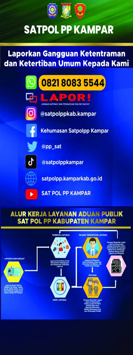 Media Sosial dan Layanan Call Center Satpol PP Kabupaten Kampar bisa di manfaatkan oleh masyarakat Kampar terkait Pengaduan pelanggaran Perda dan Perkada serta gangguan Trantibum yang ada di Lingkungan kita.